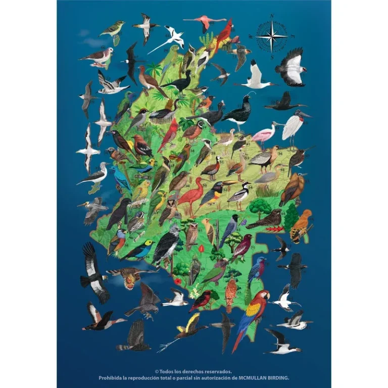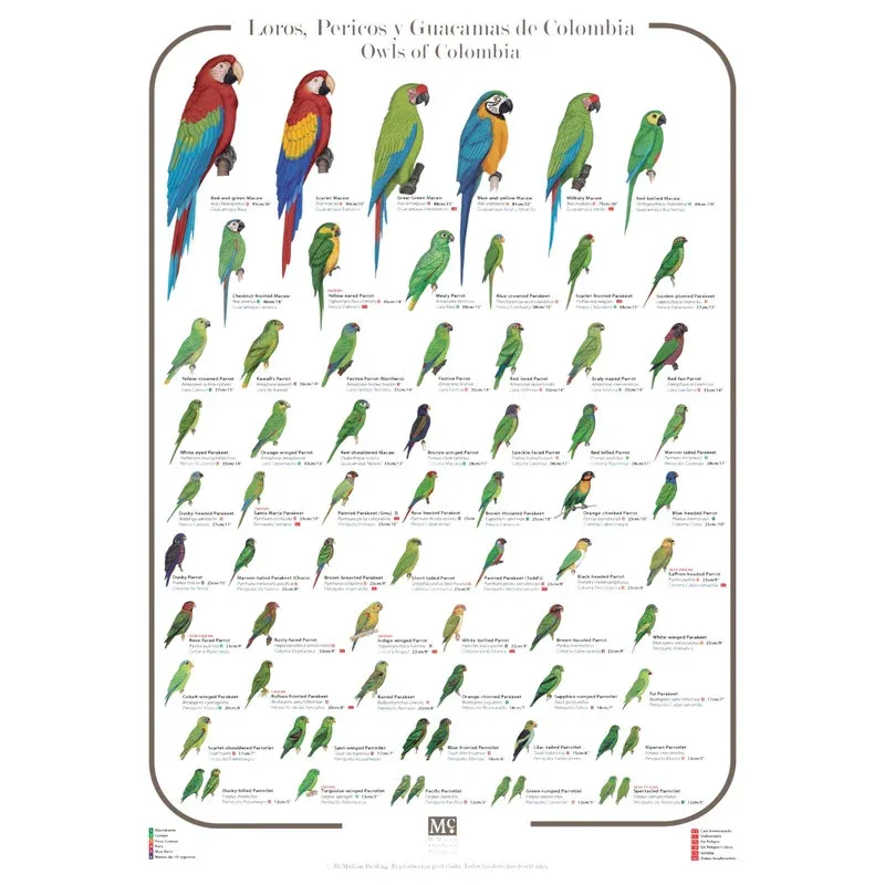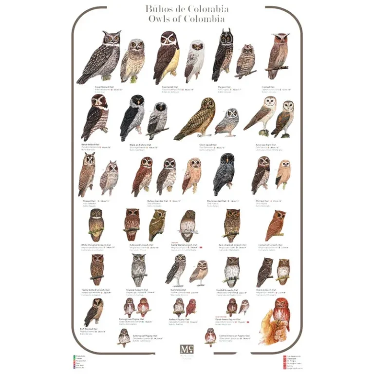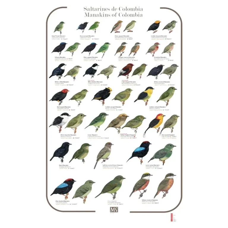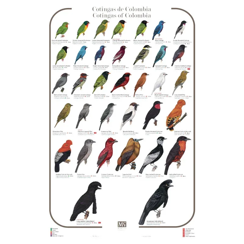 Estos afiches ilustrativos destacan la riqueza y diversidad de las aves colombianas, presentando especies emblemáticas como búhos, saltarines, colibríes, cotingas y loros, todas reconocidas por su belleza, comportamiento y colorido.
